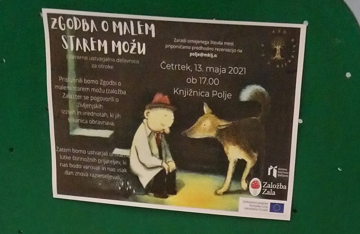 - ZGODBA O MALEM STAREM MOŽU – KUD Galerija C.C.U. in Založba Zala, 20. 5. 2021 ob 17.00, Knjižnica Jarše